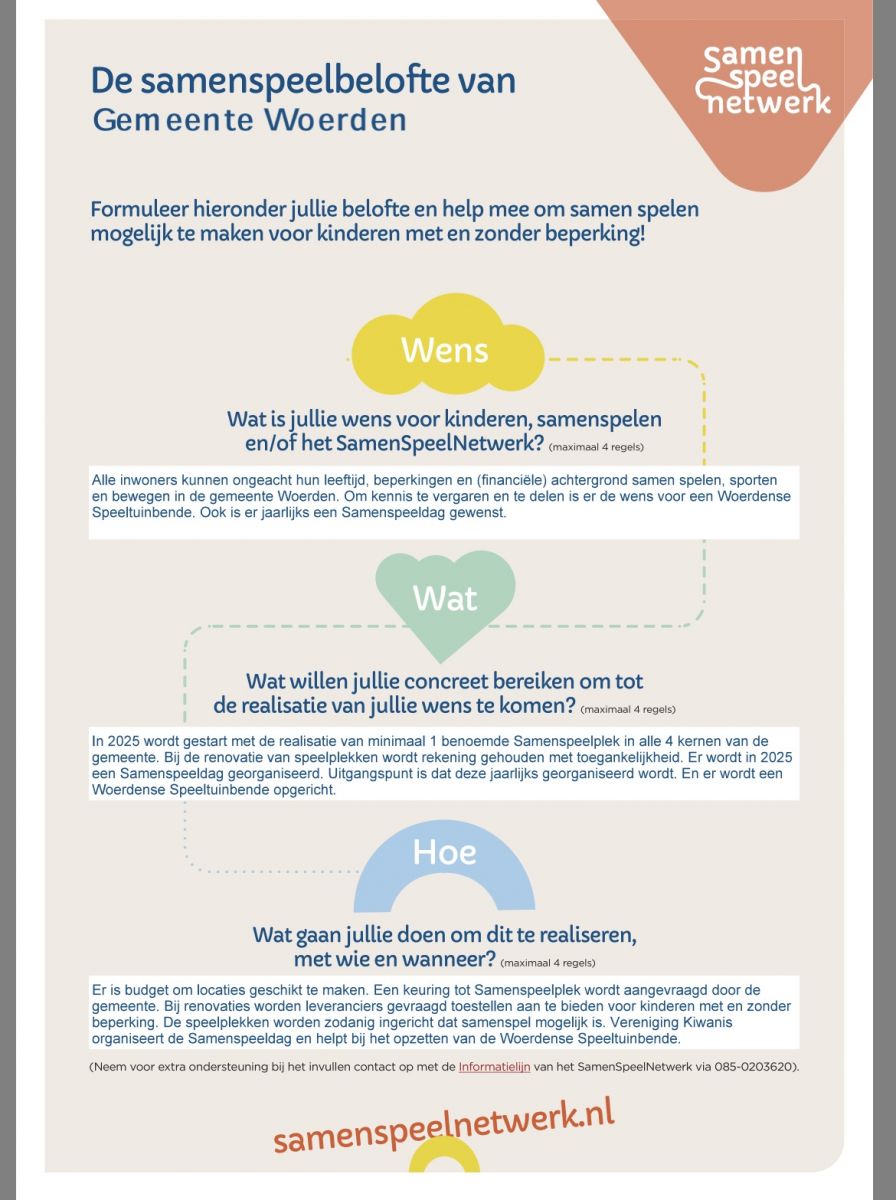 16/02/2026 - In navolging van vele andere gemeentes en organisaties heeft nu ook de gemeente Woerden de Samenspeelbelofte gedaan. Progressief Woerden is daar blij mee. Want in Woerden willen we graag dat iedereen mee kan doen met spelen en sporten. Zonder belemmeringen!